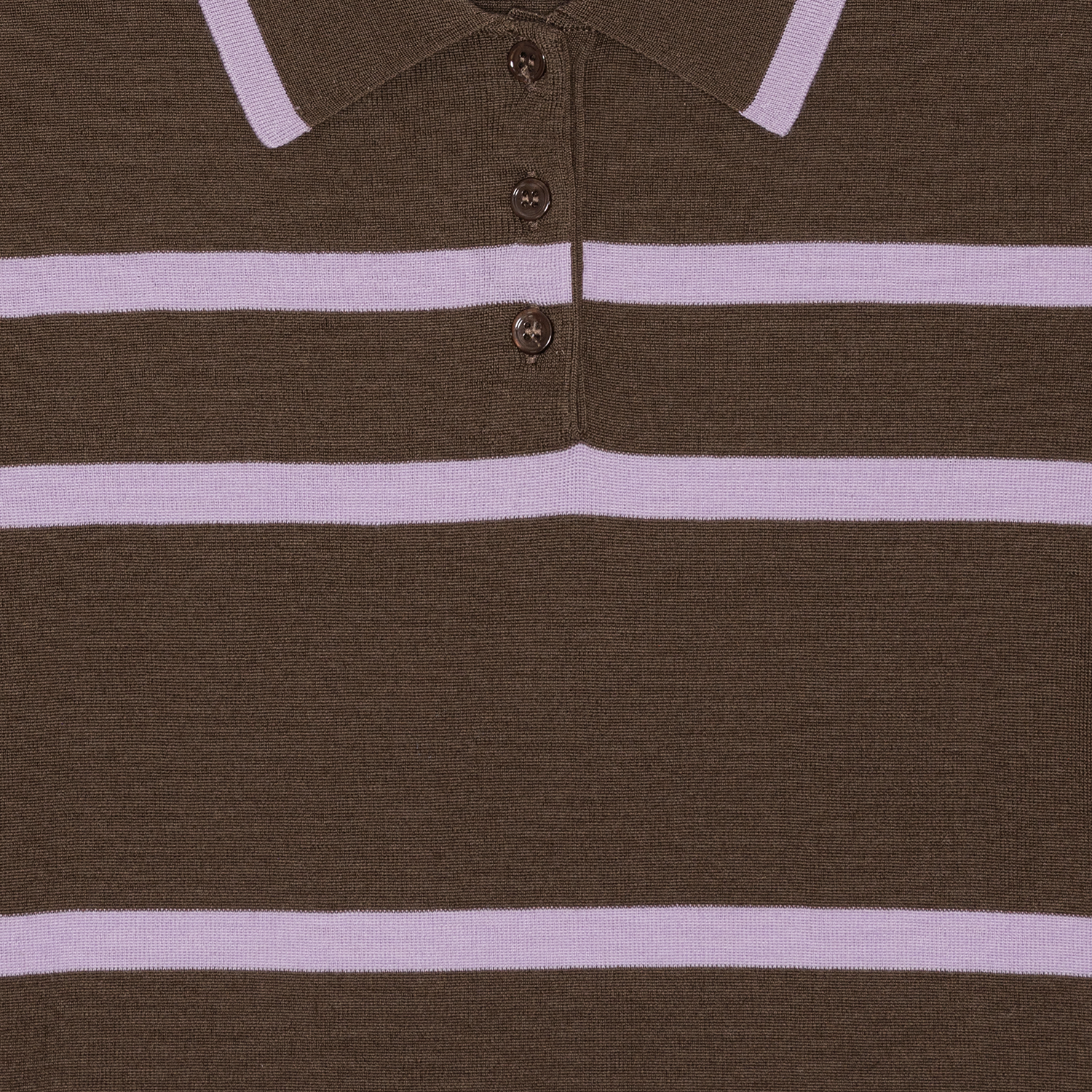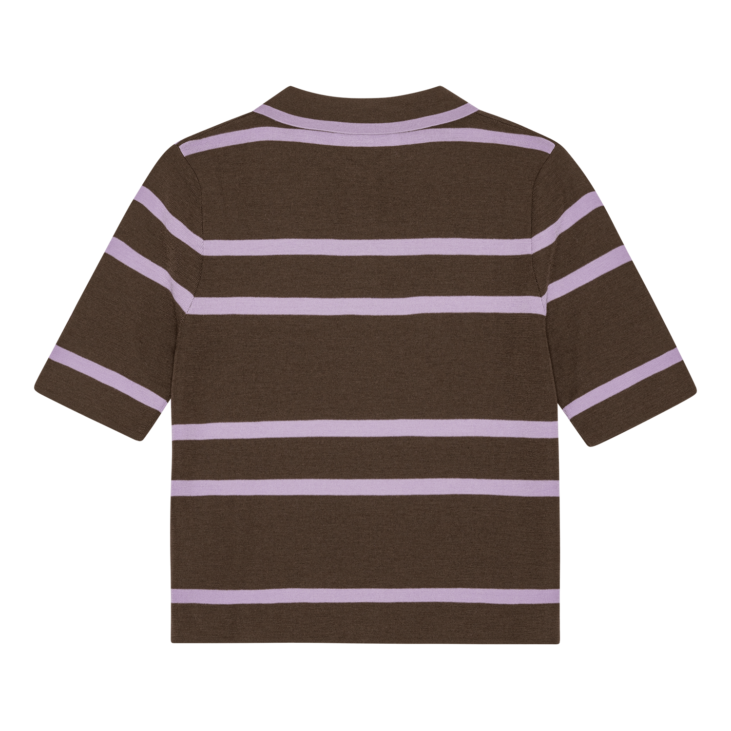 Kortærmet strikpolo i brun merinould med lilla striber og klassisk polokrave.