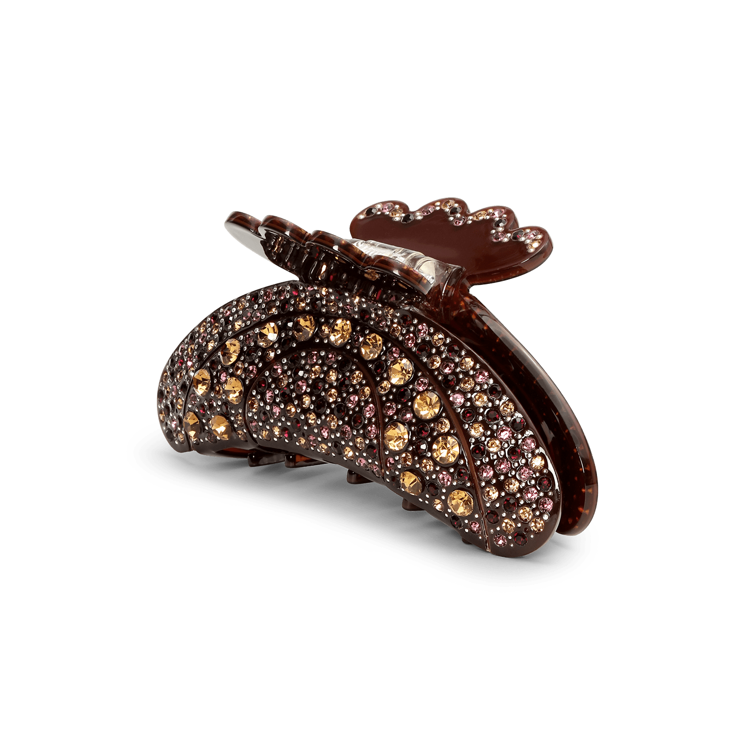En elegant hårklemme med wow-effekt. Helen Chocolate Fondant Middle er designet i en varm brun nuance og dækket af skinnende rhinsten i gyldne og rosa toner. Den dekorative overflade fanger lyset og giver dit outfit et eksklusivt twist - uanset om det er til hverdag eller en særlig anledning 🤎