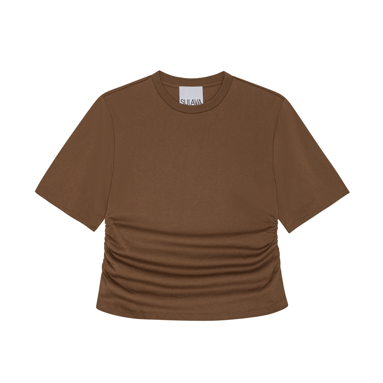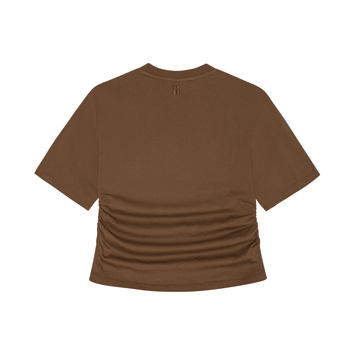 Ruched Tee er en blød og behagelig t-shirt i 100% bomuld med et moderne twist. Rynkedetaljerne i siderne skaber en flatterende pasform, mens det enkle design gør den nem at bruge til både afslappede og pænere outfits 🤎