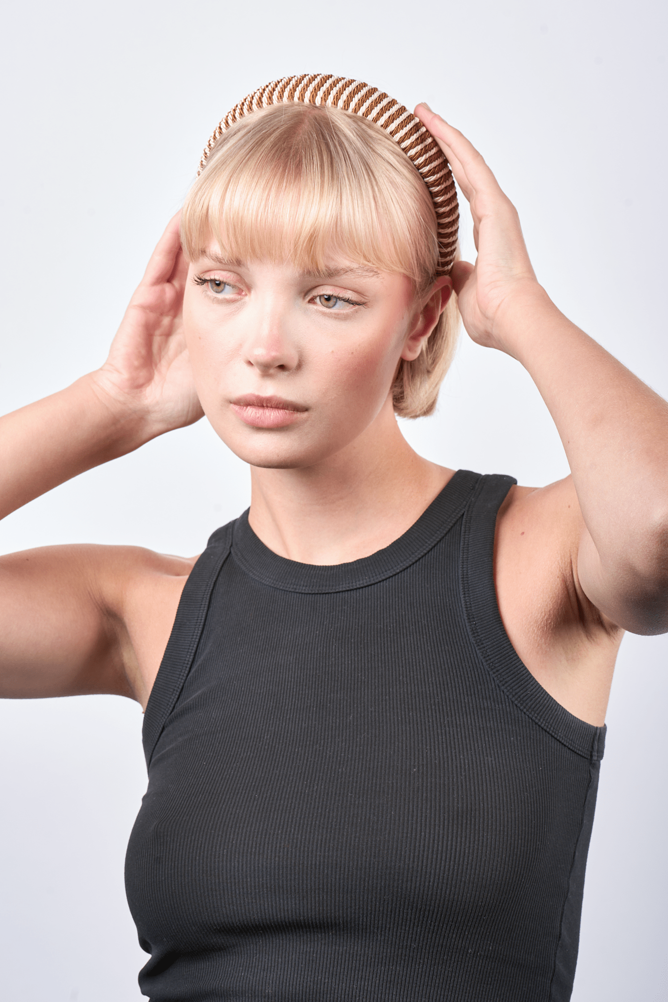 Pleje: For at bevare kvaliteten og formen på Striped Headband, aftør den forsigtigt med en blød klud. Opbevar den tørt og væk fra direkte sollys for at sikre lang holdbarhed.