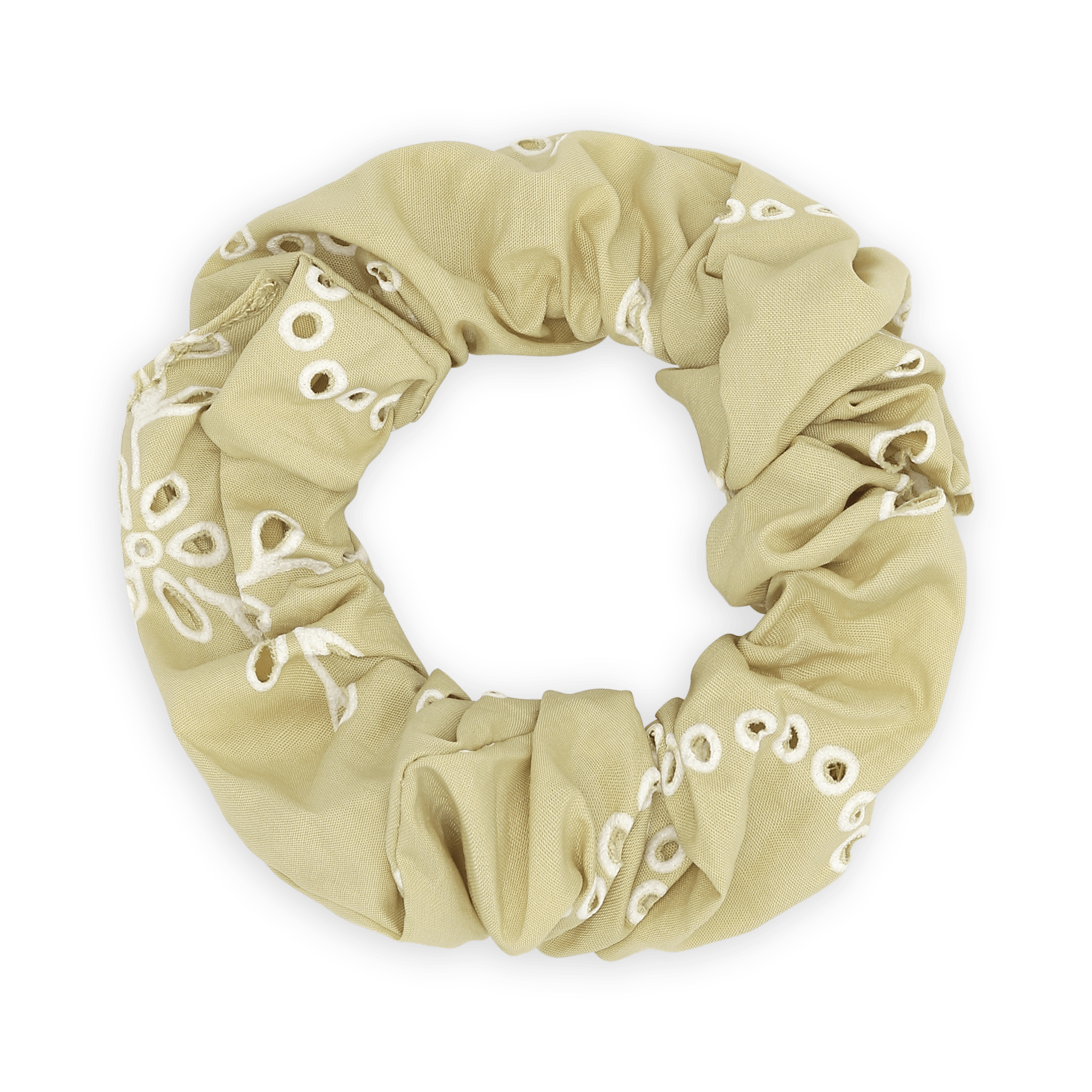 Floral Broderie Scrunchie i Pistachio er en rolig og elegant hårelastik med fine blomsterbroderier i blød grøn nuance 🌿💚