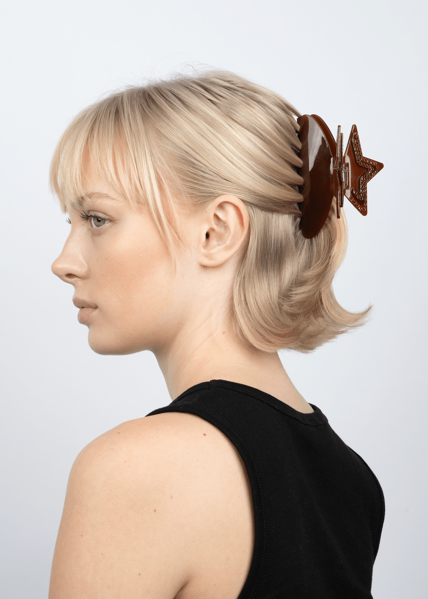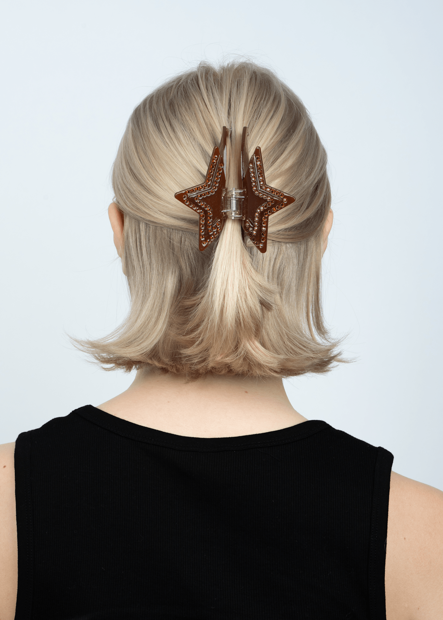 Bring lidt stjernestøv ind i hverdagen med Stacy Star Big - en hårklemme, der skiller sig ud med sin fine stjerneform og glitrende rhinsten. Den varme brune farve og det karakteristiske design giver et cool og legende udtryk, mens den kraftige fjeder sikrer et godt greb i både langt og kraftigt hår ⭐️