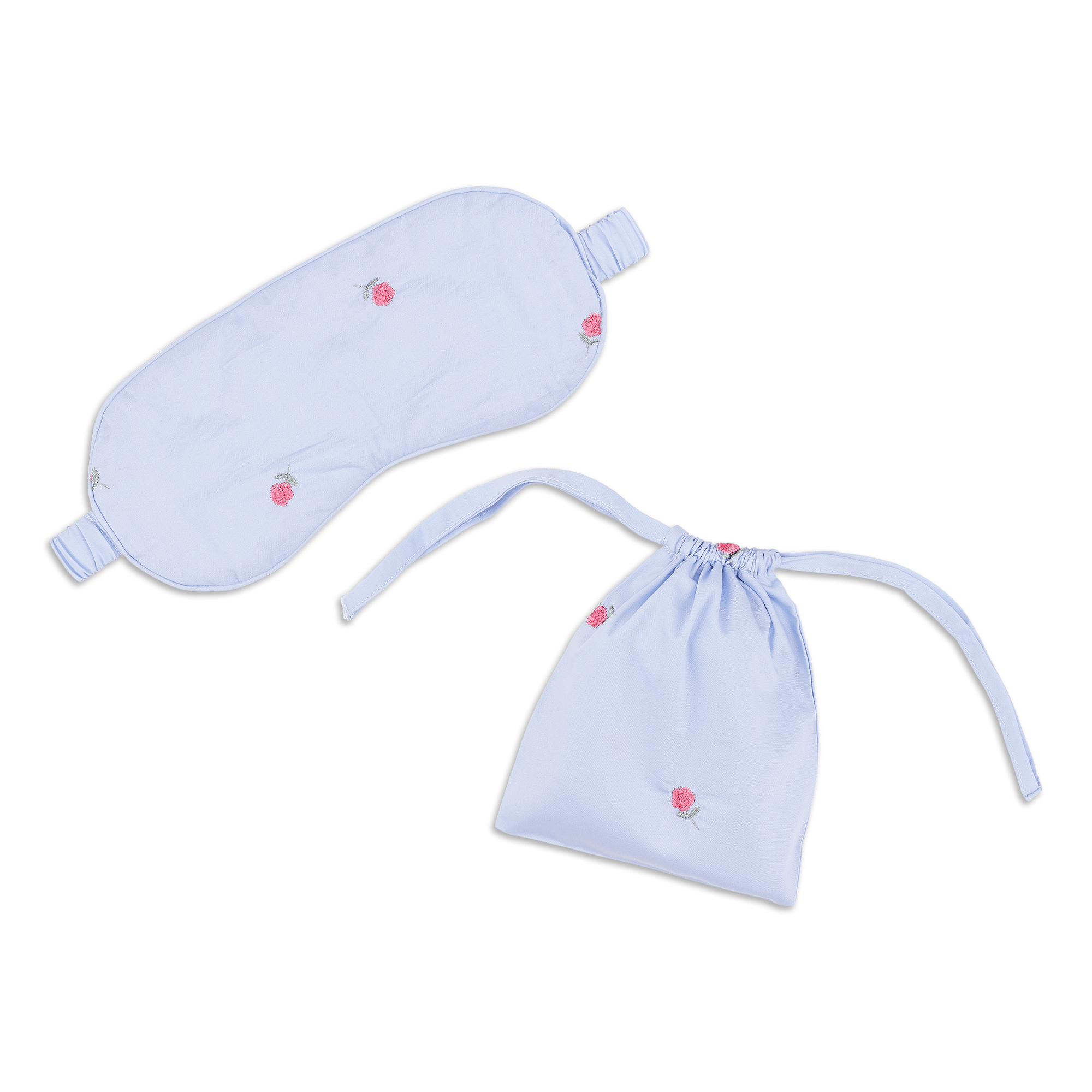 Lyseblå sovemaske i bomuld med broderede røde blomster og elastik, vist sammen med matchende opbevaringspose.