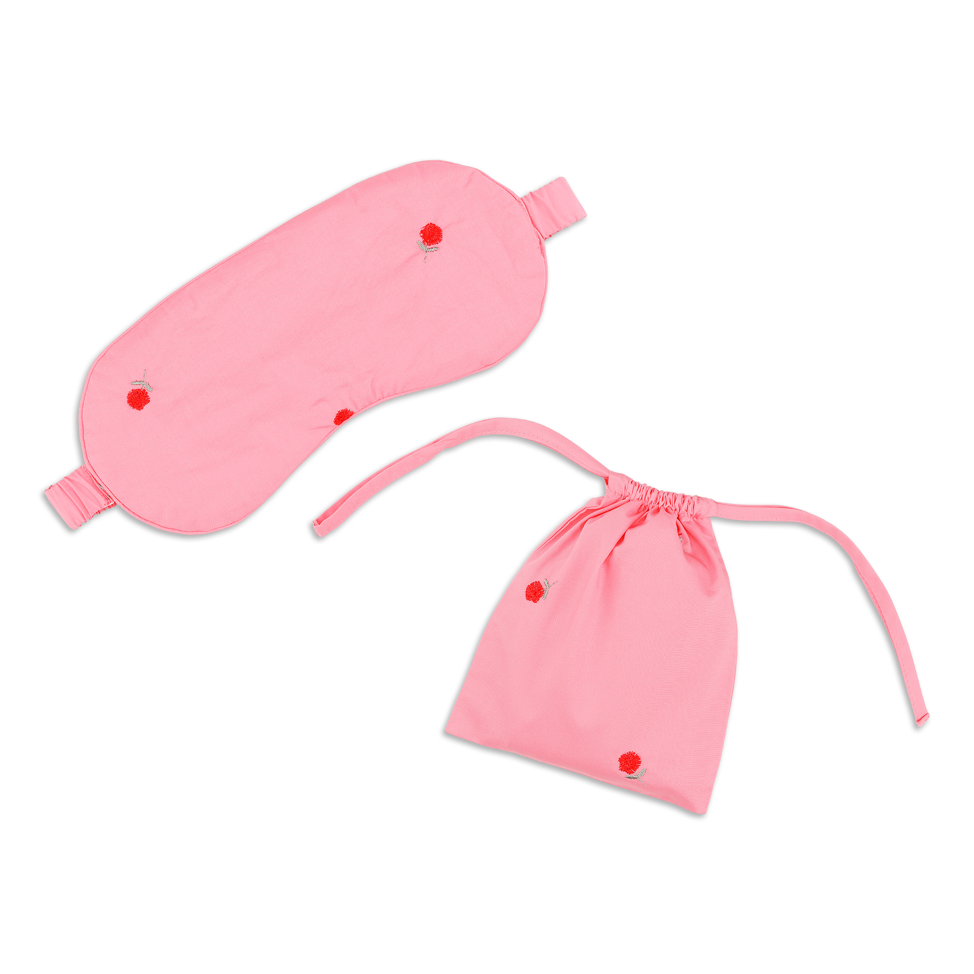 Rosa Bobbie Sleep Mask med røde blomsterbroderier og matchende opbevaringspose