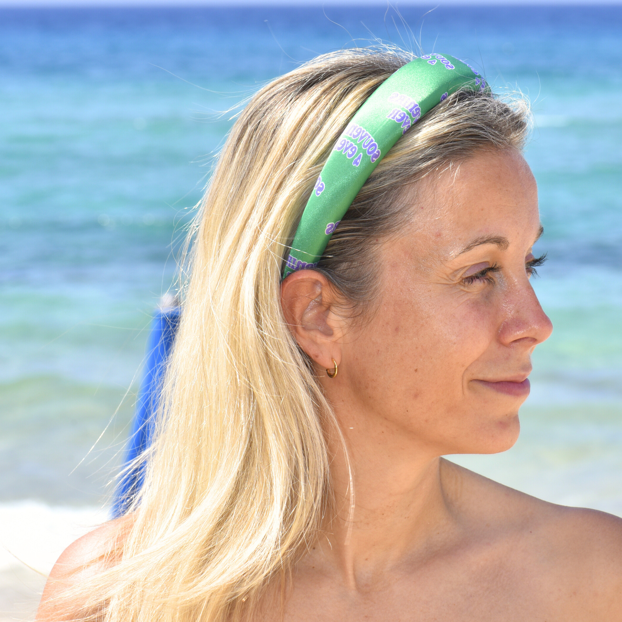 Charter Headband er til dig, der ikke er bange for farver og godt humør. Den klare grønne nuance kombineret med det grafiske print "Souvenirs 4 Ever" giver dit look personlighed - uanset om du har håret løst, sat op eller pjusket efter en stranddag. Den er både komfortabel og dekorativ, og fungerer som en lille fest på toppen af hovedet 💚