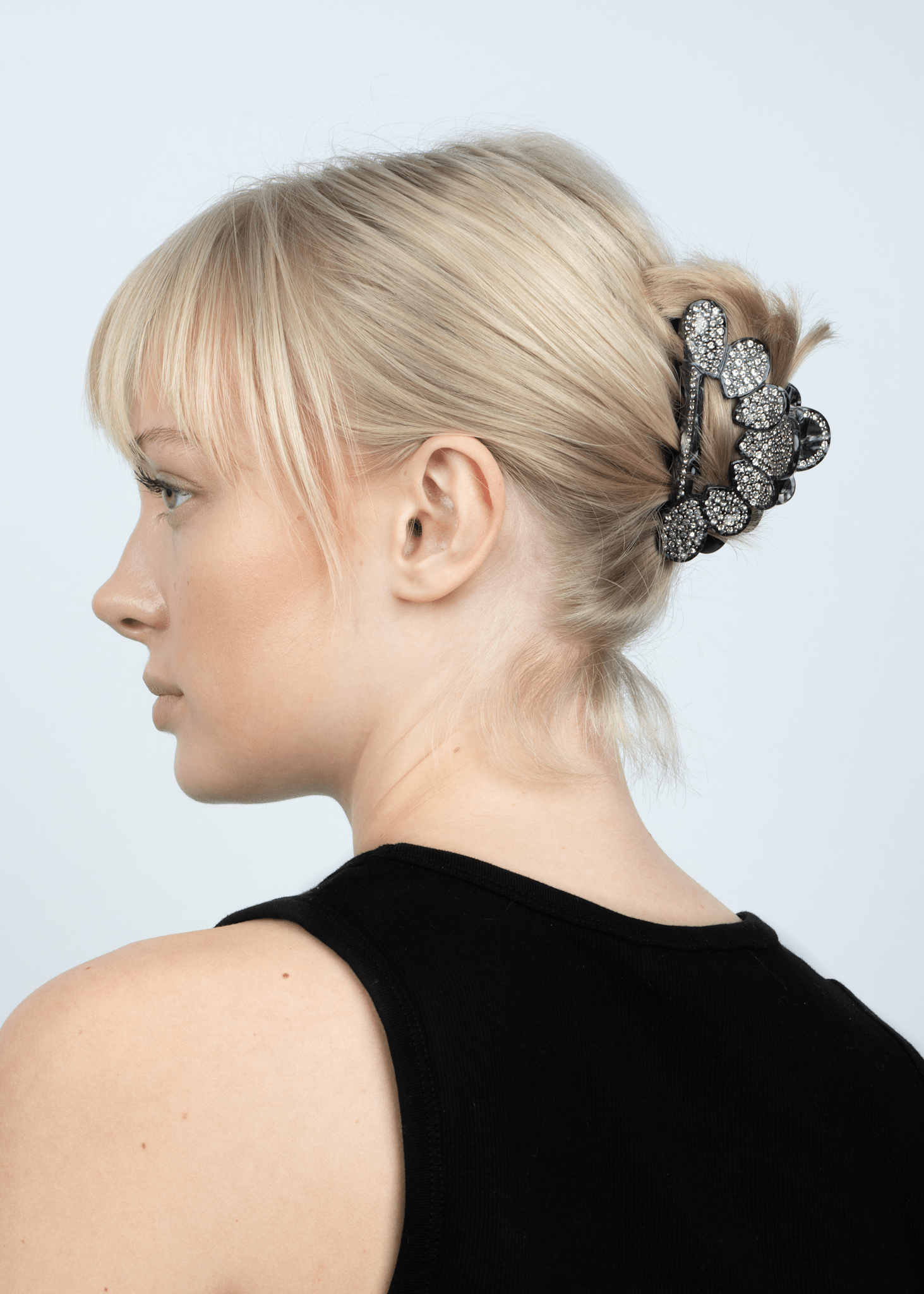 Den dybe, skinnende sorte farve giver et sofistikeret og tidløst look, mens de glitrende rhinsten gør klemmen til en elegant detalje, der tilfører ekstra shine til din frisure.