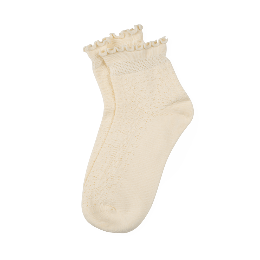 Emma Ankle Socks i creme bringer et feminint og let udtryk til din garderobe. De delikate blondedetaljer og den bløde, bølgede kant giver strømperne et romantisk præg - perfekt til dig, der elsker små, stilfulde detaljer. Den cremehvide farve gør dem nemme at matche med både lyse og farverige sko 🤍