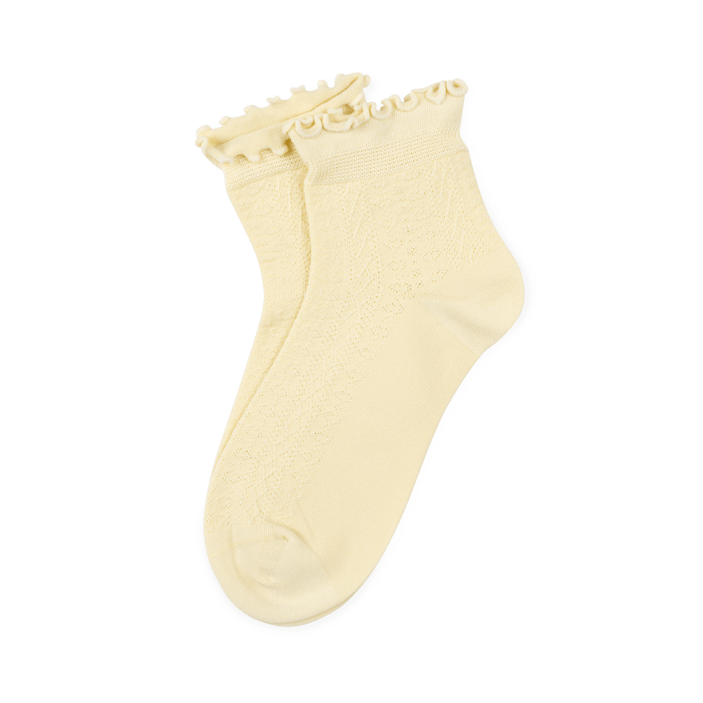 Emma Ankle Socks i lysegul er perfekte til dig, der elsker små, stilfulde detaljer med et feminint twist. Det fine blondemønster og den bølgede afslutning skaber et let og luftigt look, mens den lyse farve giver sokkerne et friskt og sommerligt udtryk 💛