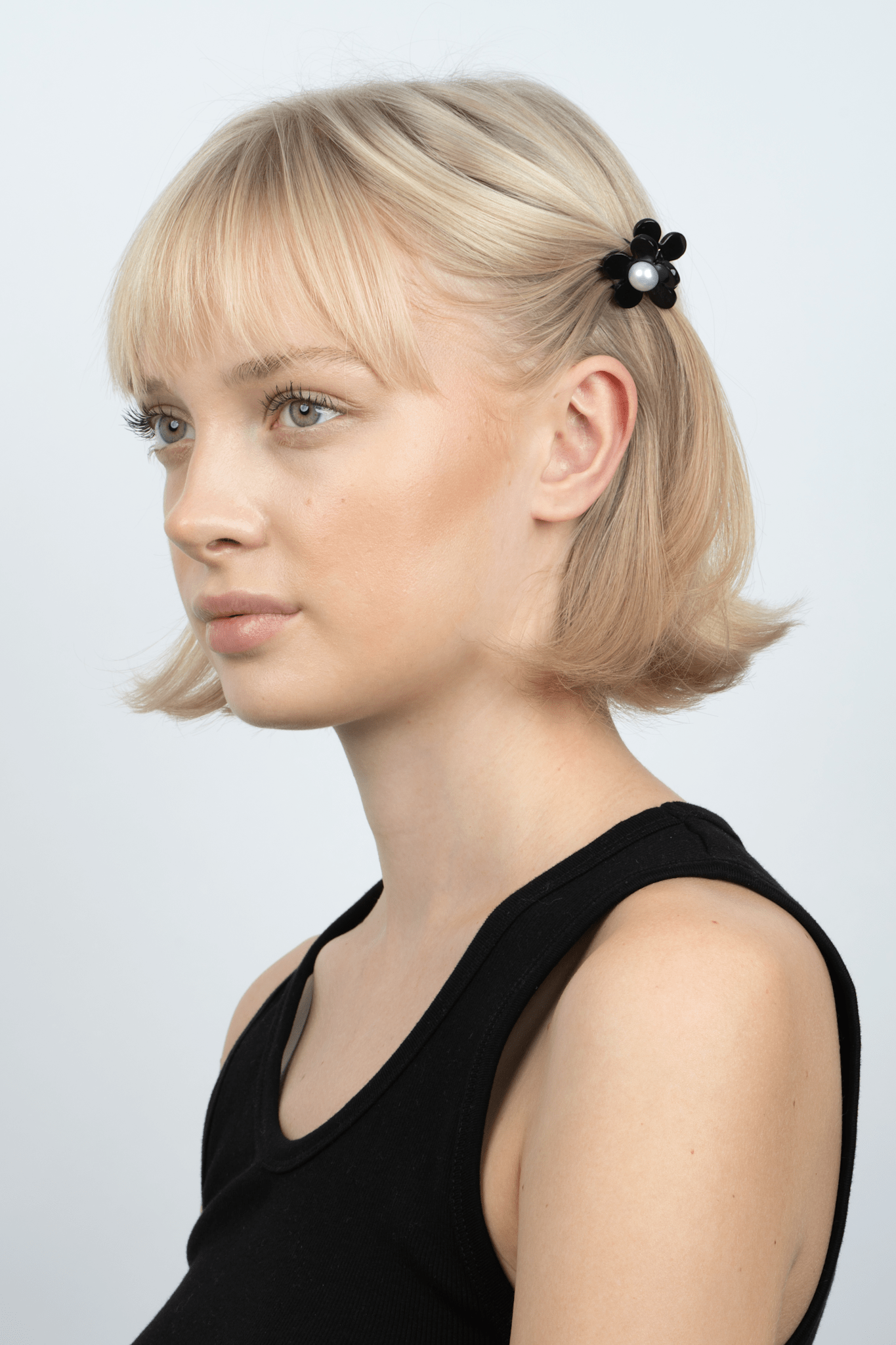 Med Eva Classic Flower Mini i sort får du en lille hårklemme, der både er funktionel og tilføjer en elegant detalje til din frisure.