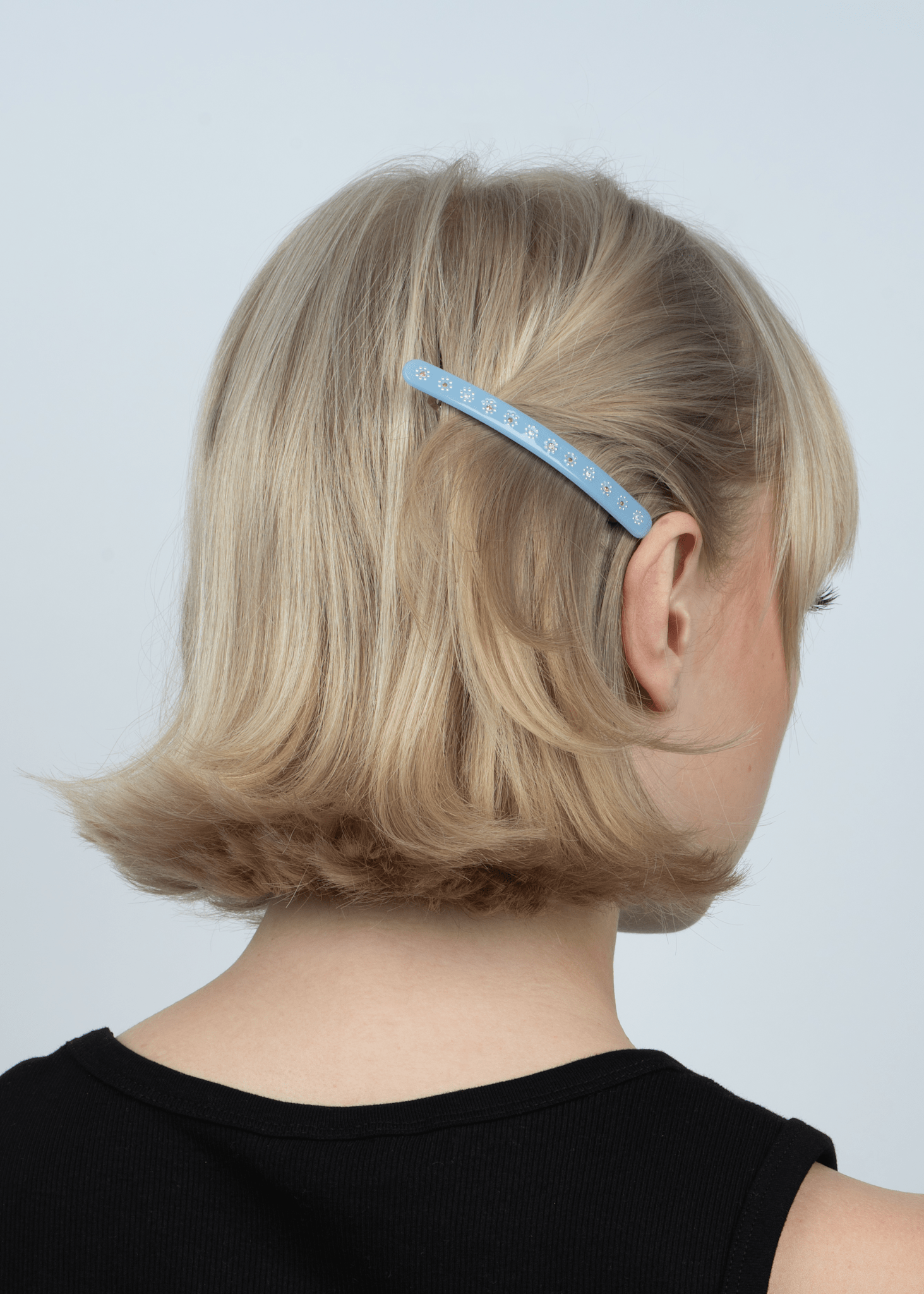 Evergreen Clip i lyseblå er det perfekte match til dig, der elsker fine detaljer og et strejf af glitter. Spændet har en elegant, aflang form og er dekoreret med små blomster, der hver især er pyntet med glimtende sten i rosa og gyldne nuancer. Det er både let og stærkt - og perfekt til at holde håret væk fra ansigtet med stil 🩵
