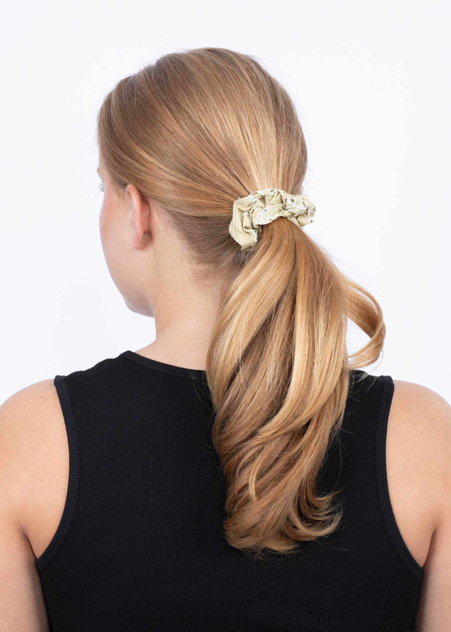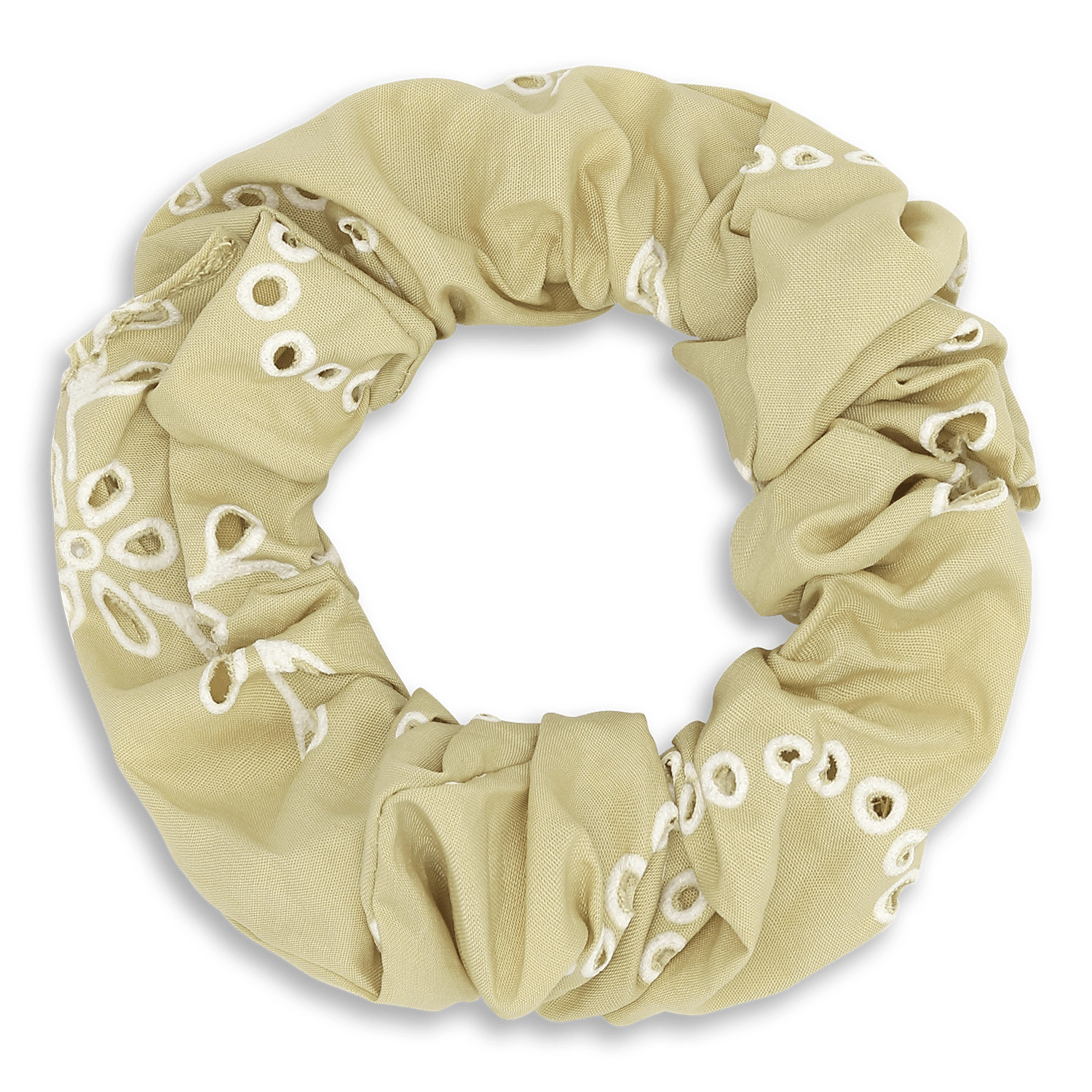Floral Broderie Scrunchie i Pistachio er en rolig og elegant hårelastik med fine blomsterbroderier i blød grøn nuance 🌿💚