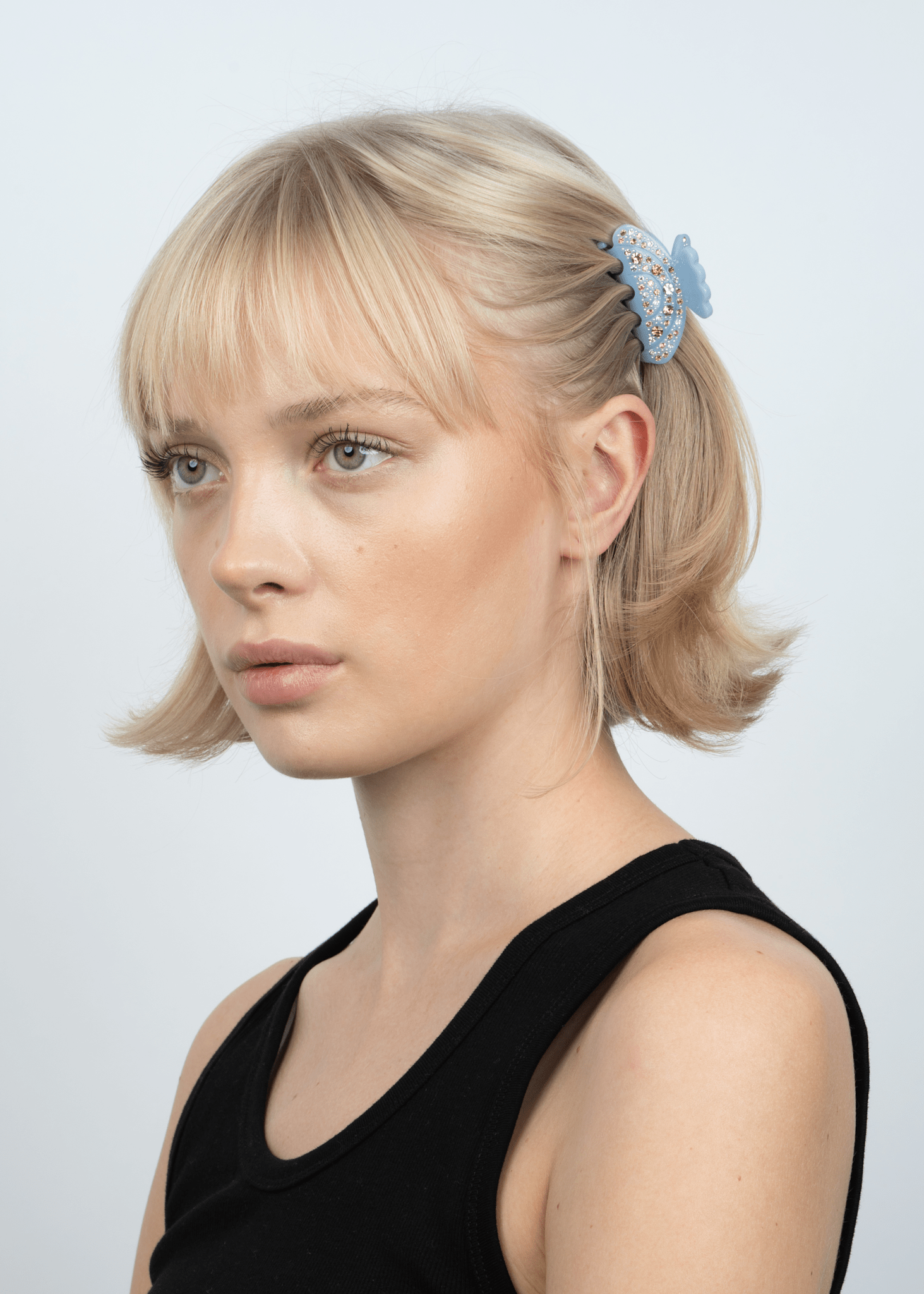 Helen Starry Sip Mini er en sød og funklende hårklemme i lyseblå - pyntet med farverige rhinsten i rosa, klar, gyldne og champagne-nuancer. Den lille størrelse gør den perfekt til pandehår, små opsætninger eller bare som en ekstra fin detalje i håret 🩵
