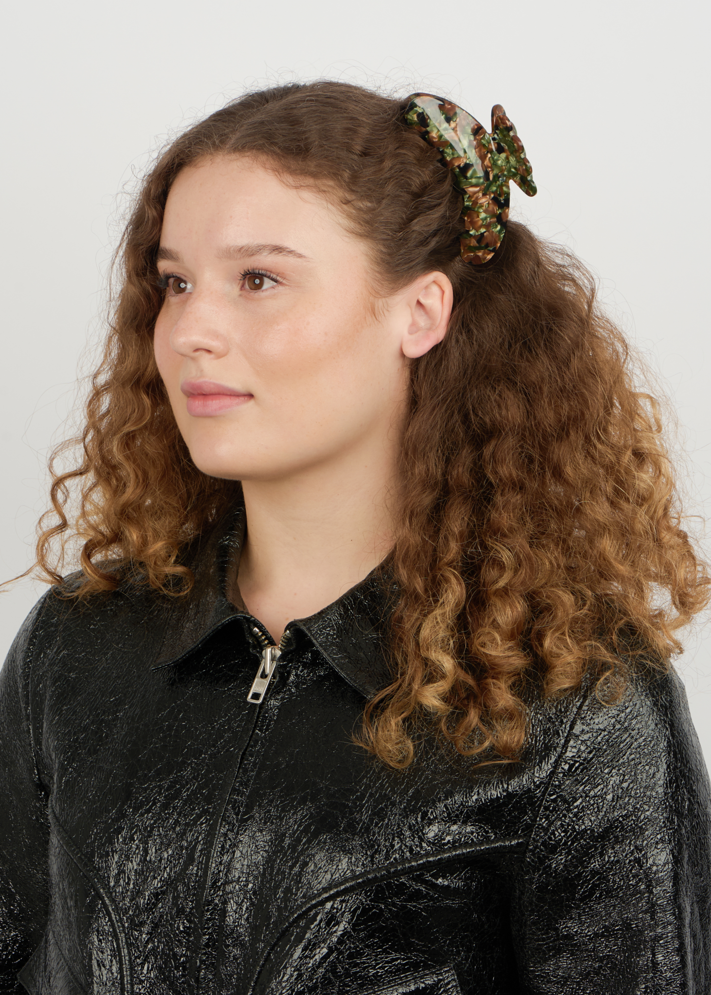 Gør plads til et power look med Helle Army Big! Med sit unikke mix af grøn, brun og sort skaber den et råt og cool statement, som løfter selv den simpleste frisure. Den store størrelse gør det nemt at samle håret op i én bevægelse - og du kan være sikker på, at det bliver siddende. Perfekt til dig, der elsker accessories med kant og karakter 🌿
