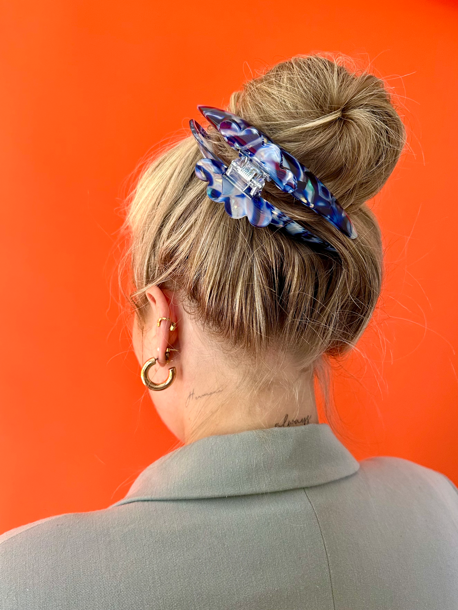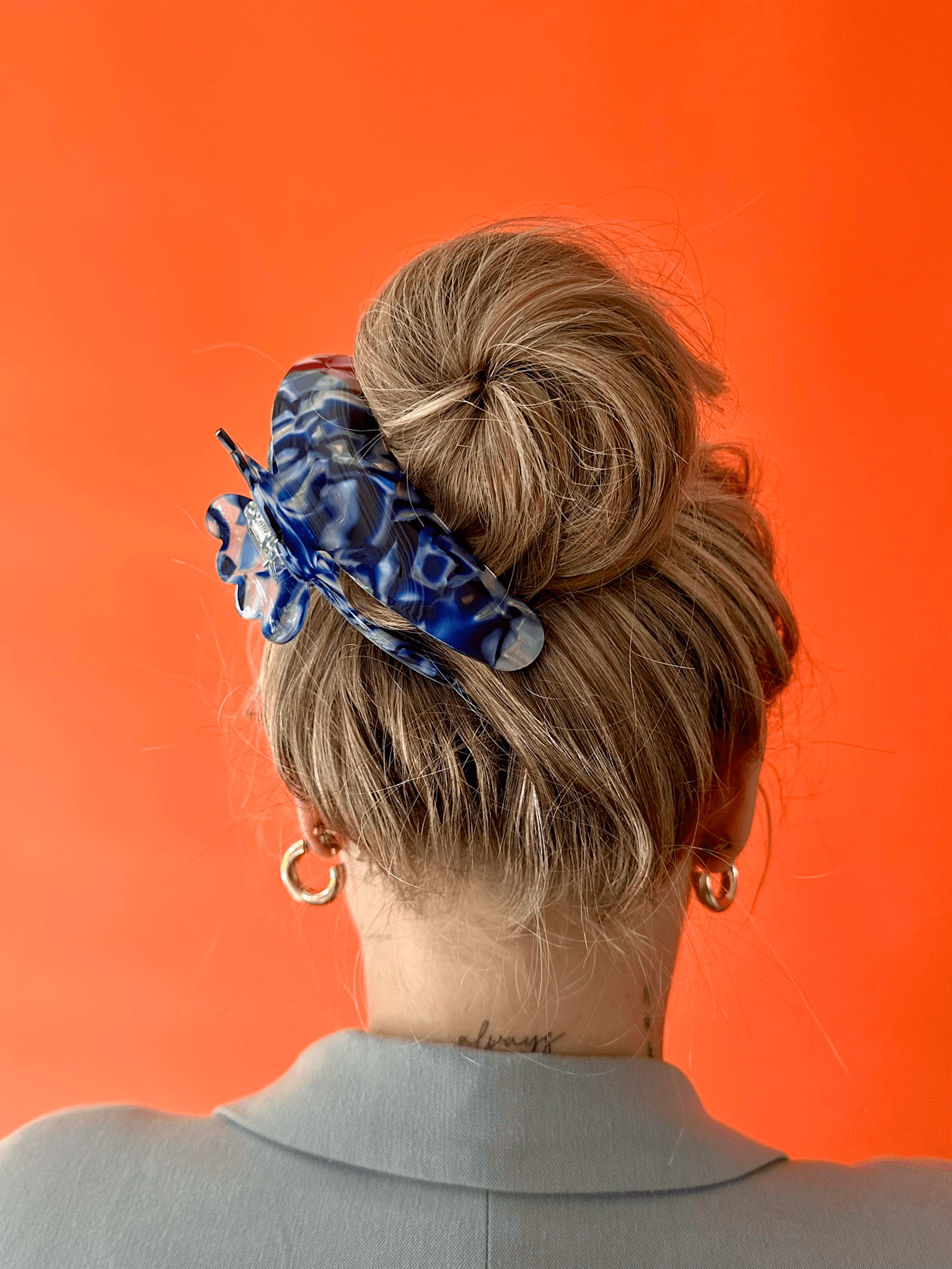 Giv dit hår et cool twist med Helle Denim Biggest. Den store hårklemme er perfekt til at samle tykt eller langt hår, samtidig med at den tilfører din frisure et moderne og legende udtryk. Den smukke blå marmorerede farve gør klemmen til en stilfuld detalje, du kan bruge igen og igen 💙