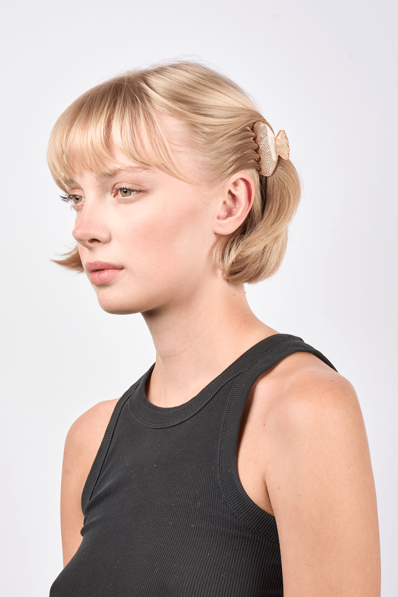 Med sit stærke greb og kompakte størrelse er klemmen ideel til fint hår eller til at skabe små detaljer i en opsætning. Den neutrale beige nuance gør den nem at style og passer til enhver lejlighed.