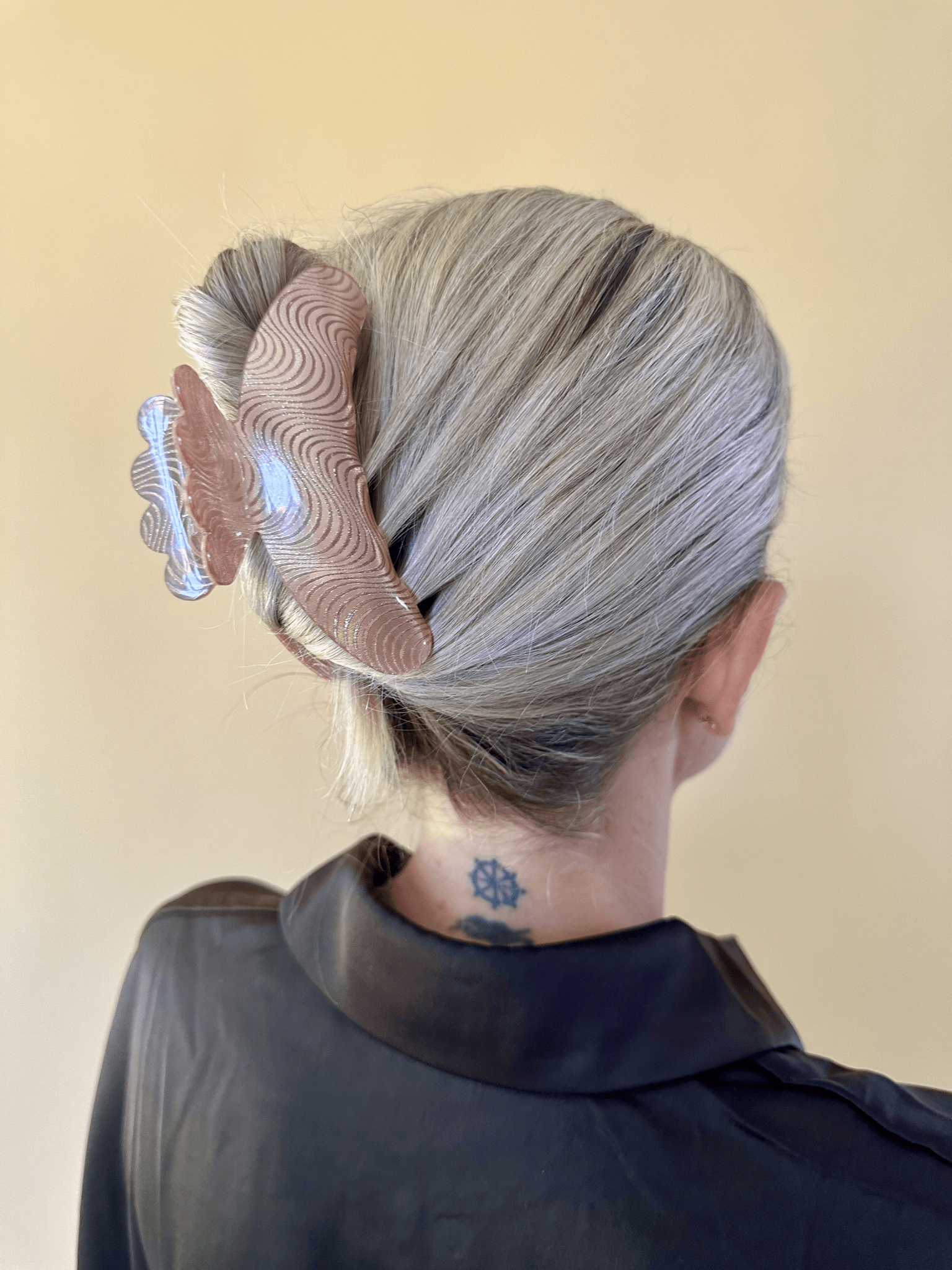 Helle Sprightly Big i rosa er hårklemmen, der emmer af glimmer og good vibes. Med sit bløde bølgemønster og glitrende finish føles den både let og luksuriøs - som et strejf af rosé-solskin i håret. Den store størrelse giver et solidt greb, så du let kan style alt fra løst opsat hår til et messy twist. Et legende statement, der både kan shine på kontoret og på caféen 🌸