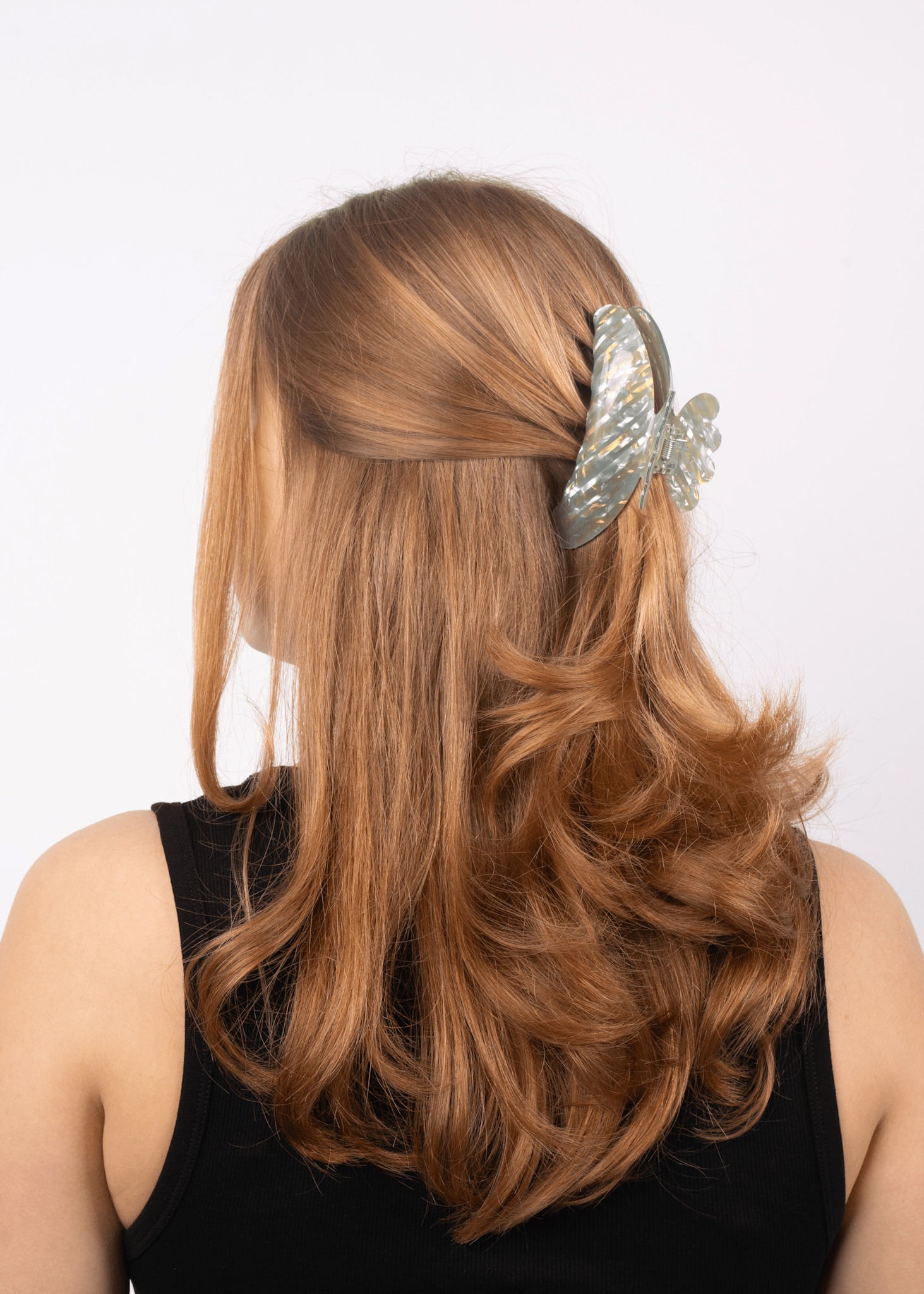Den stærke fjeder sikrer et pålideligt greb uden at trække i håret. Den glansfulde perlemorseffekt giver klemmen dybde og elegance, hvilket gør den til en alsidig accessory, der både kan bruges til hverdag og når du vil gøre lidt ekstra ud af din frisure.