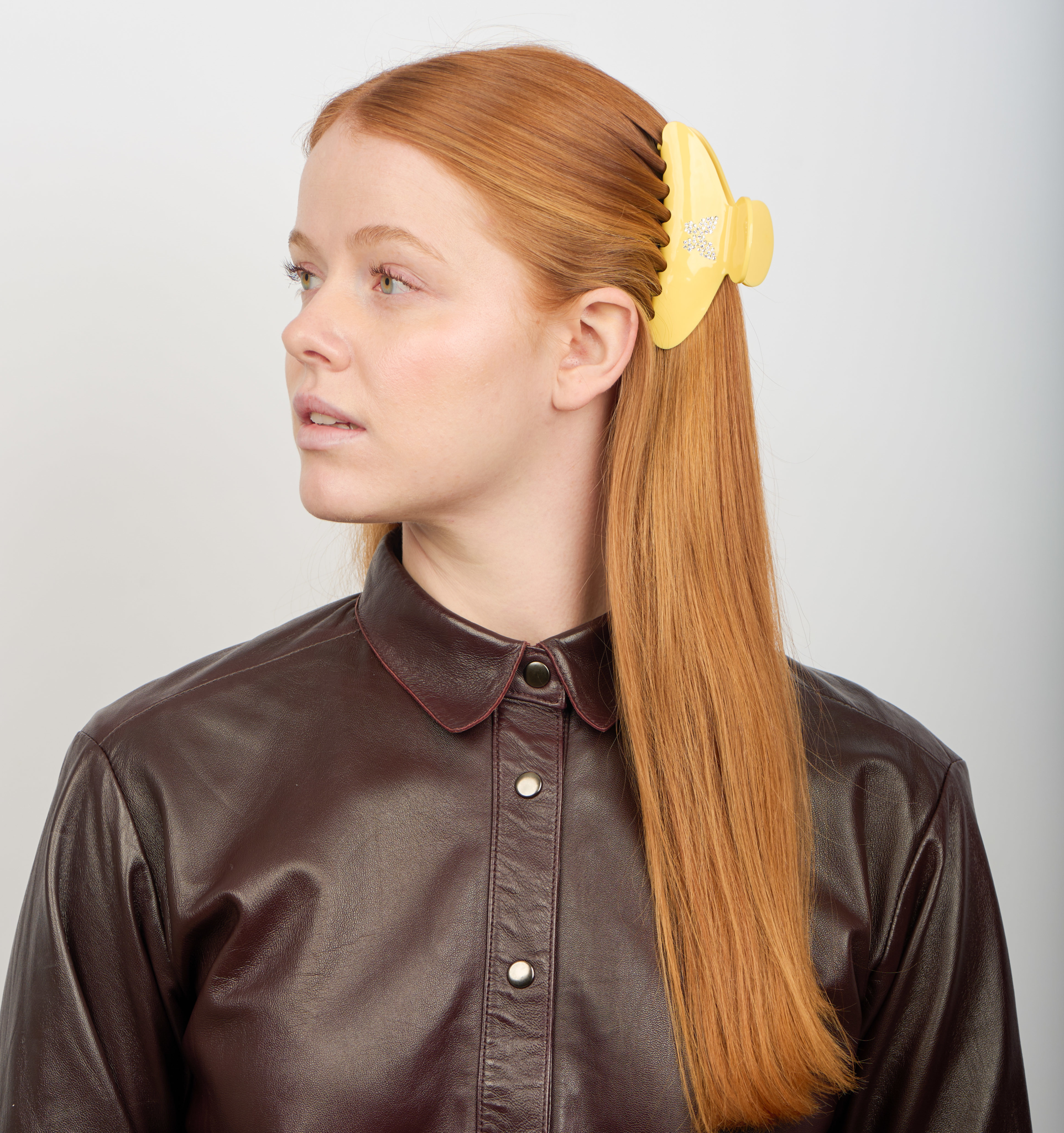 Giv dit look et strålende boost med Ida Crystal Big i en frisk gul farve. Den elegante sommerfugl i funklende rhinsten tilføjer et legende og feminint touch, der skiller sig ud - både til hverdag og særlige anledninger. Klemmen har et stærkt greb, som gør den perfekt til dig med langt eller kraftigt hår 💛
