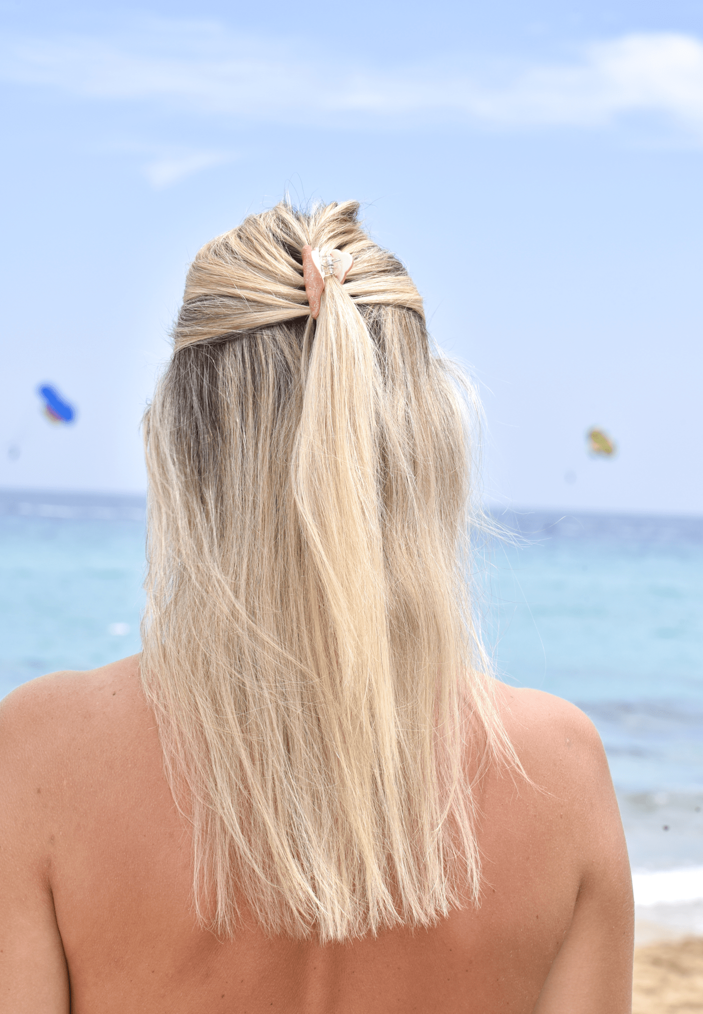 Brug den til at samle pandehåret, lave en half-up eller sætte små sektioner væk fra ansigtet. Den er let at bruge og nem at tage med - klar til at pifte dit look op med et strejf af sommerstemning.
