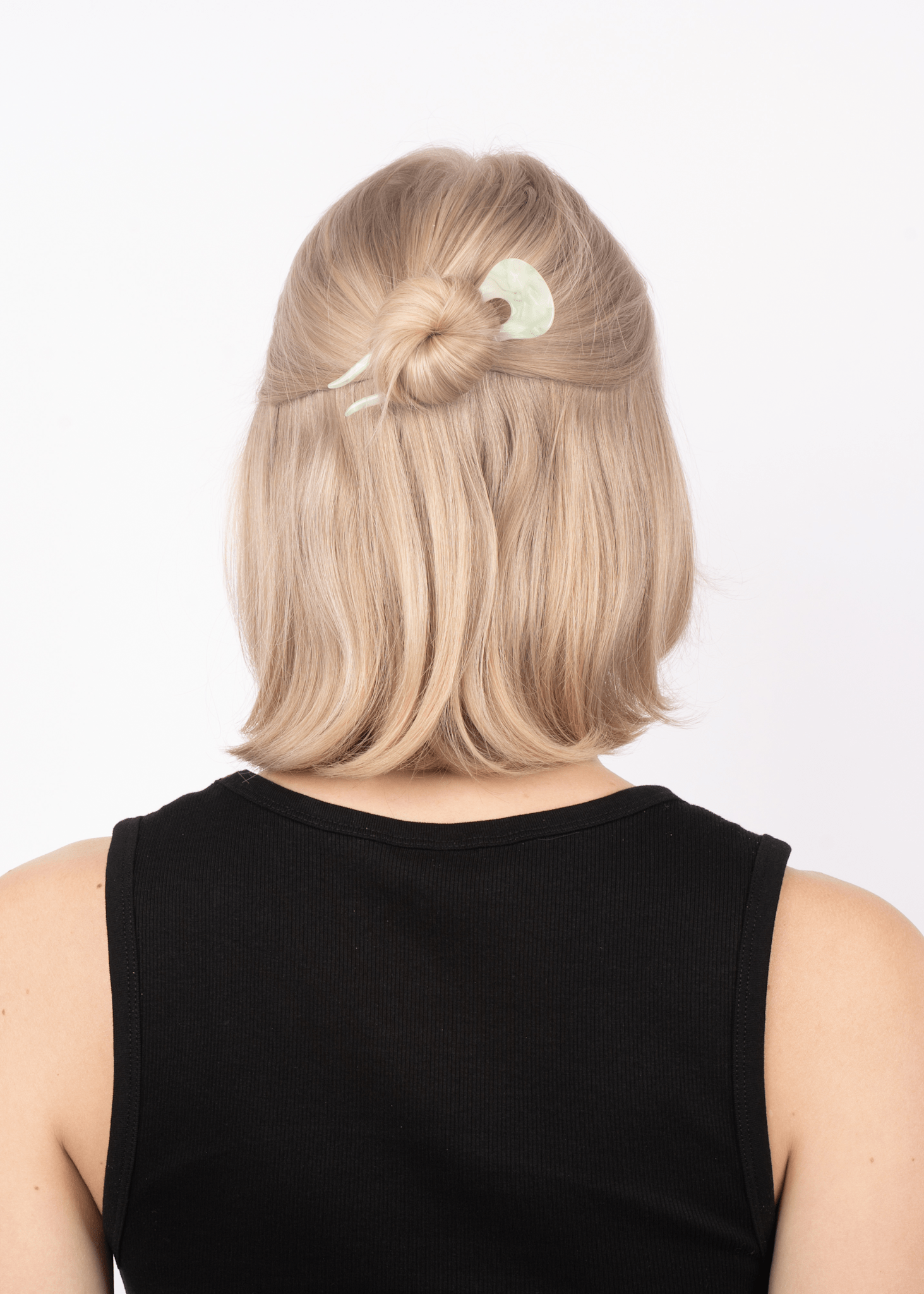 Brug hårnålen til at holde små sektioner af håret på plads eller som en del af en elegant opsætning. Den grønne marmoreffekt tilfører en stilfuld og frisk detalje til din frisure.