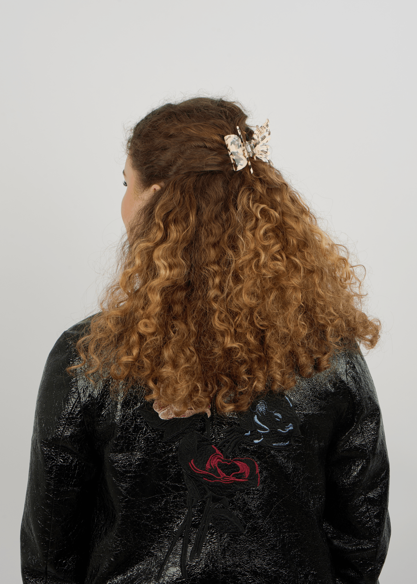 Pleje: Opbevar din hårklemme tørt og væk fra direkte sollys for at bevare farver og form.