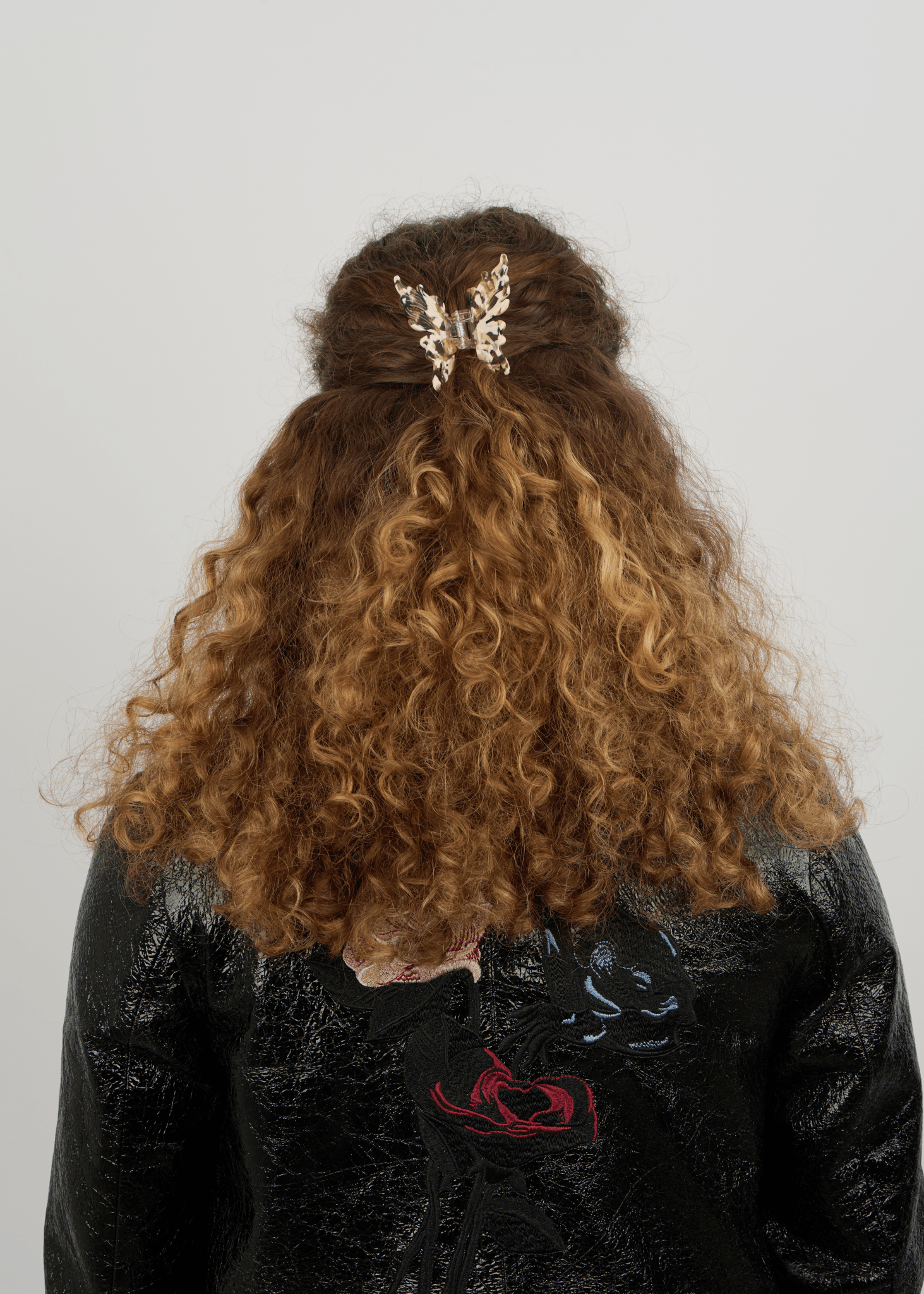 Pretty Butterfly Claw er en iøjnefaldende hårklemme formet som en sommerfugl, lavet i et marmoreret mix af brune, sorte og cremefarvede toner. Den har et legende, men elegant udtryk, som både kan bruges til hverdag og særlige lejligheder 🤎