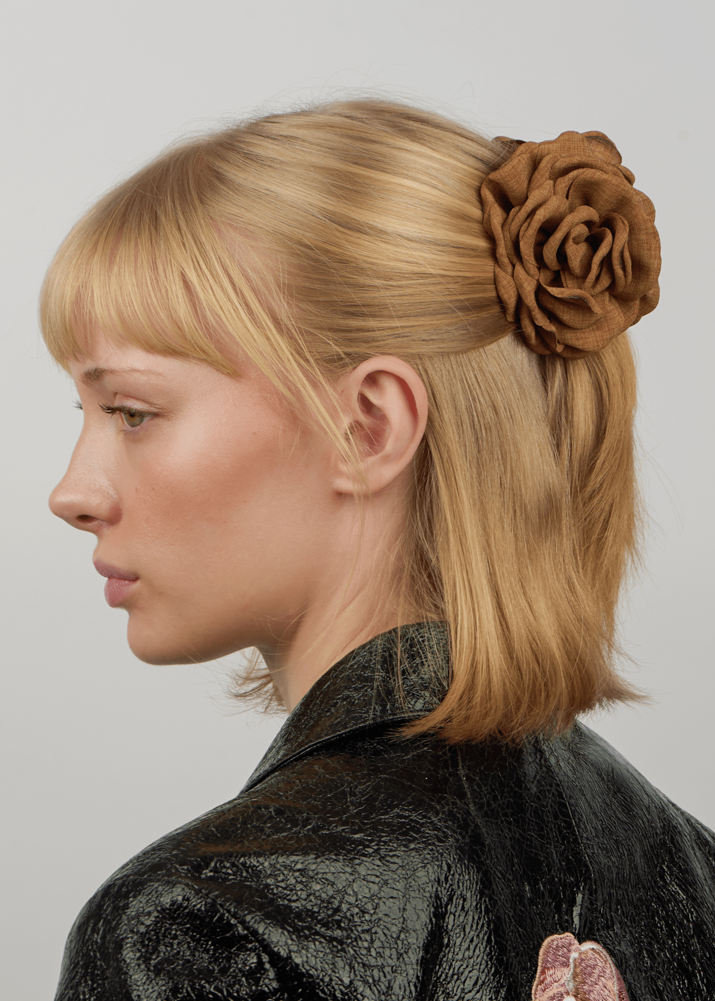 Rosa Hair Claw i lysebrun er en elegant og dekorativ hårklemme formet som en stor blomst. Den varme lysebrune nuance tilfører et naturligt og tidløst udtryk, mens det smukke blomsterdesign giver et feminint touch til din frisure. Med sit stærke greb holder klemmen håret sikkert på plads hele dagen, uanset om du har fint eller kraftigt hår 🤎