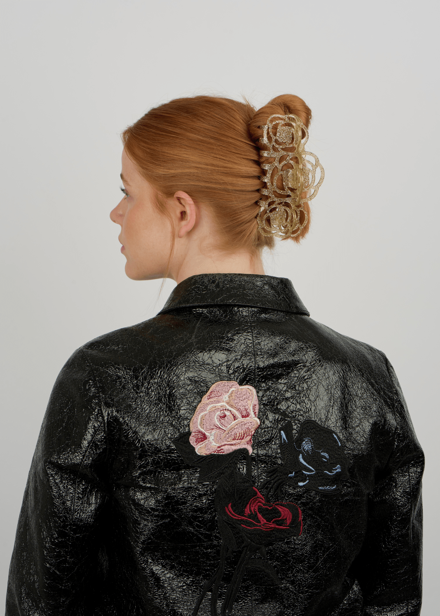 Rosie Giga holder håret sikkert på plads og er ideel til en løs knold, en halvopsætning eller som et dekorativt element i din frisure. Det smukke guldglitter og de fine rosemotiver gør den perfekt til både hverdag og festlige anledninger.