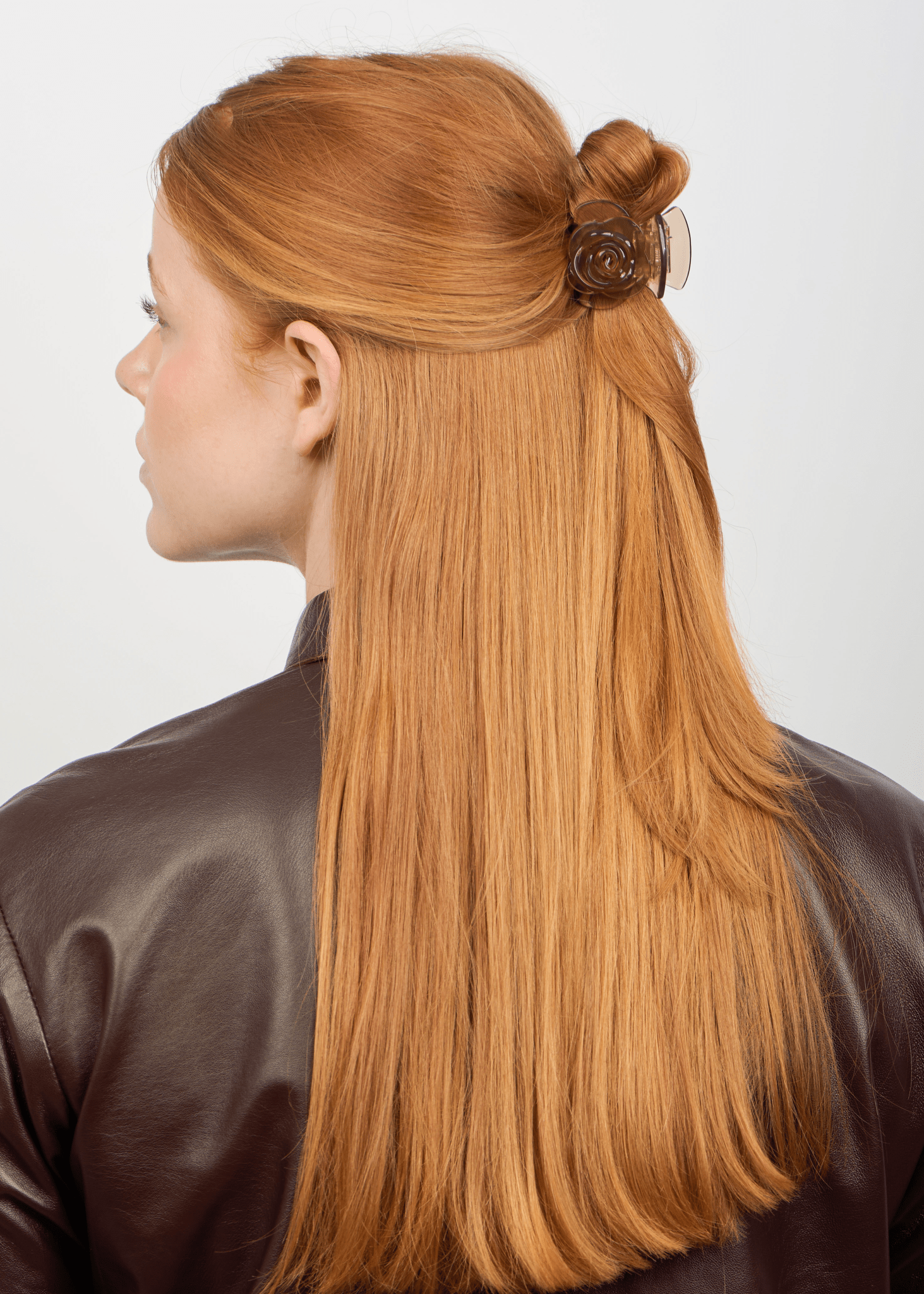 Rosie Plain Mini i brun er en elegant og minimalistisk hårklemme med et let gennemsigtigt design. Den varme brune nuance tilfører et naturligt og sofistikeret udtryk, mens den kompakte størrelse gør den ideel til fint hår eller til at holde små sektioner sikkert på plads 🤎