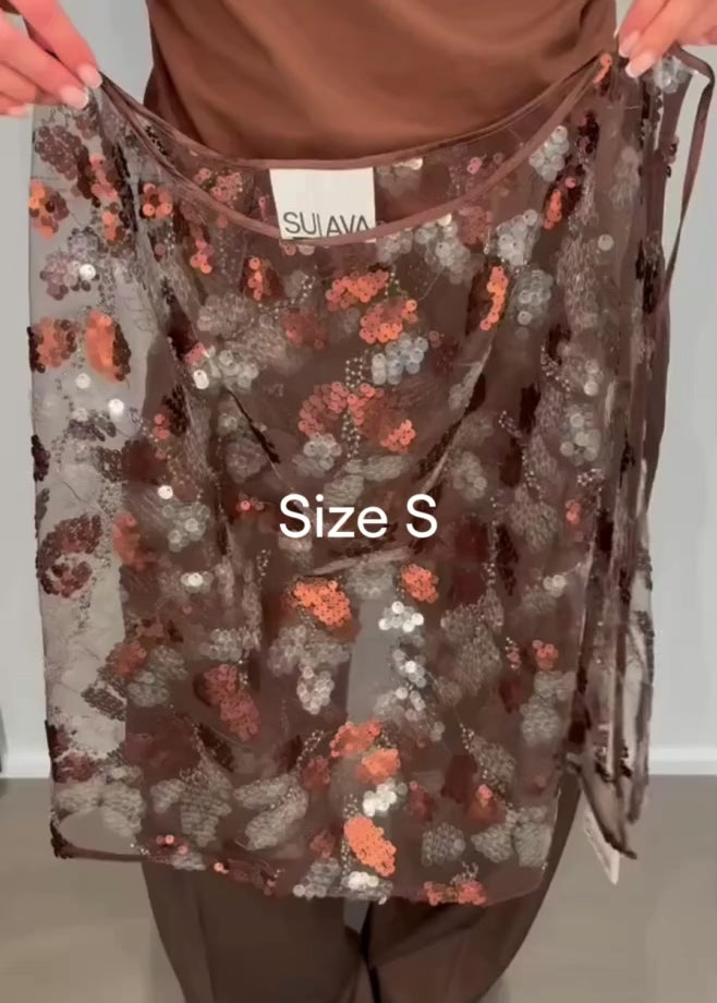Sequin Wrap Skirt er et statement-piece, der balancerer glamour og ubesværet coolness. Nederdelen er skabt i et let, transparent mesh med håndsyede pallietter i bronze- og sølvtoner, der leger med lyset og bevæger sig smukt, når du gør 🤎