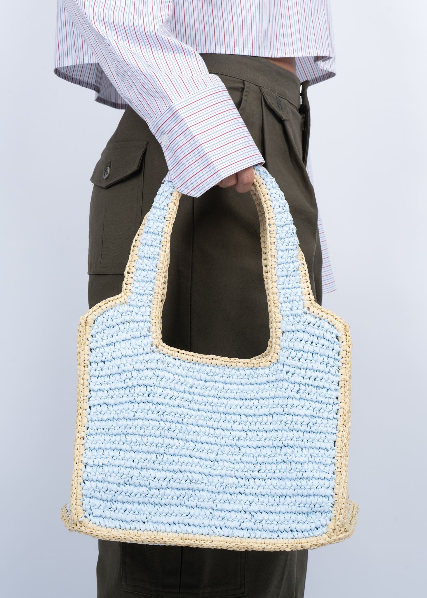 Waffle Cloud Bag i Bubblegum er en let og luftig taske i blå og beige papirflet – designet med blød volumen og et strejf af nostalgi 💗🧁