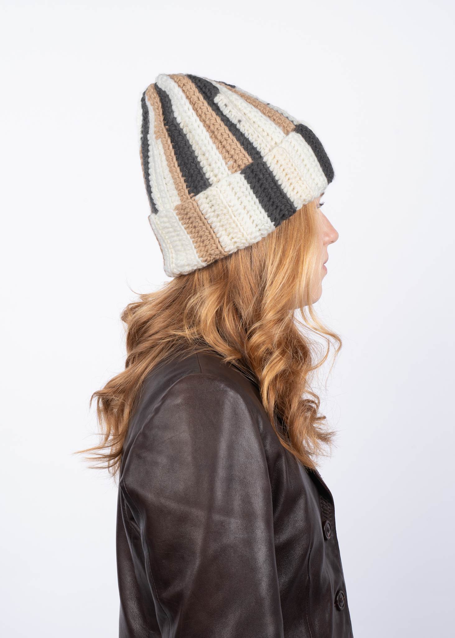 Walter Beanie er alt andet end almindelig. Den chunky, hæklede struktur og de varme striber i beige, brun og råhvid gør den til et blikfang - uden at larme. Den har et cool vintage vibe og passer perfekt til både vintergarderoben og dine mere chill forårslooks. En hue med personlighed! 🤎