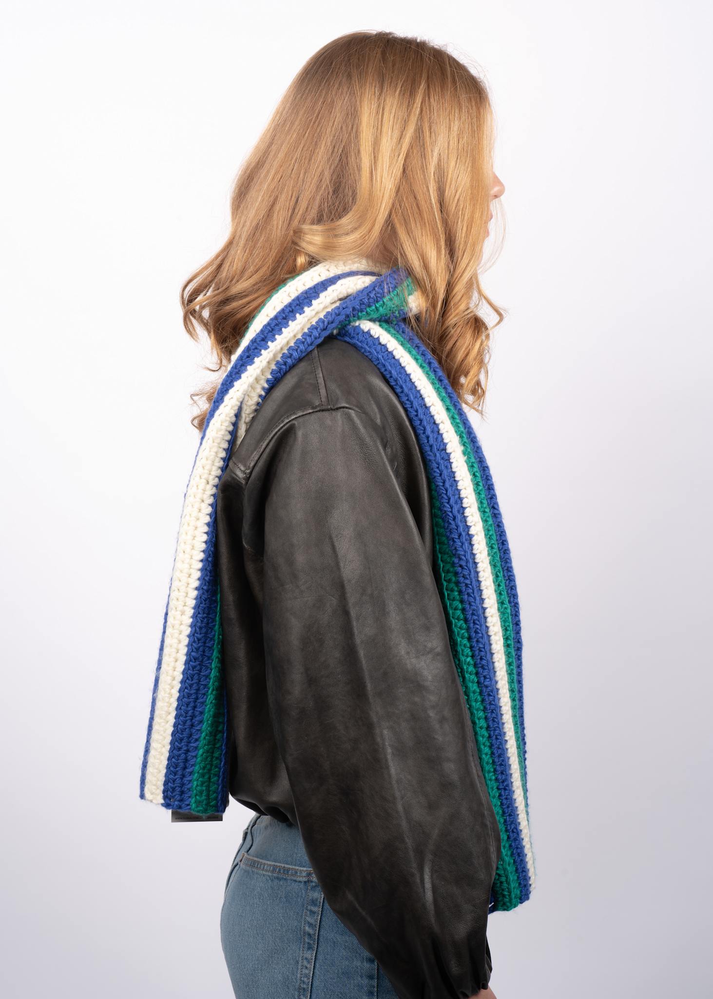 Walter Scarf i blå, grøn og creme er til dig, der gerne vil holde varmen - uden at gå på kompromis med farverne. Det chunky strik og de brede striber giver et cool og hyggeligt udtryk, som passer perfekt til både hverdagsjakken og weekendens gåtur 💙